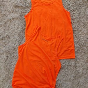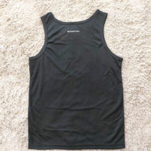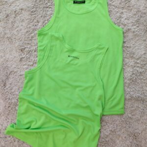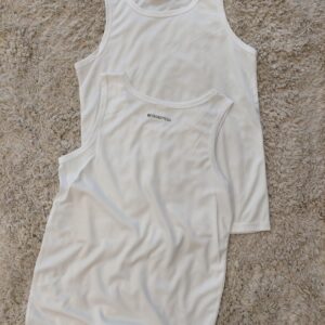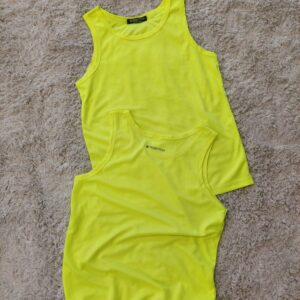 Canotta con girocollo e giromanica bordati, tessuto traspirante, struttura con cuciture laterali.